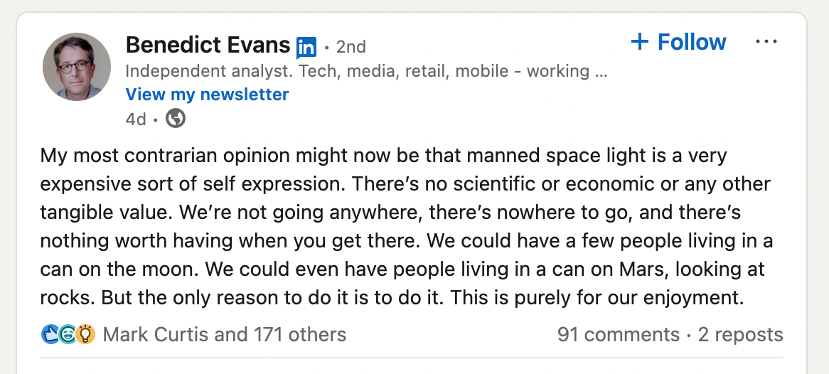 I'm inclined to agree with Evans's central insight here. Space exploration is a form of human self-expression, and the other explanations for it — we'll discover new materials! We'll do some science up there! — tend to be post-hoc rationalisations.