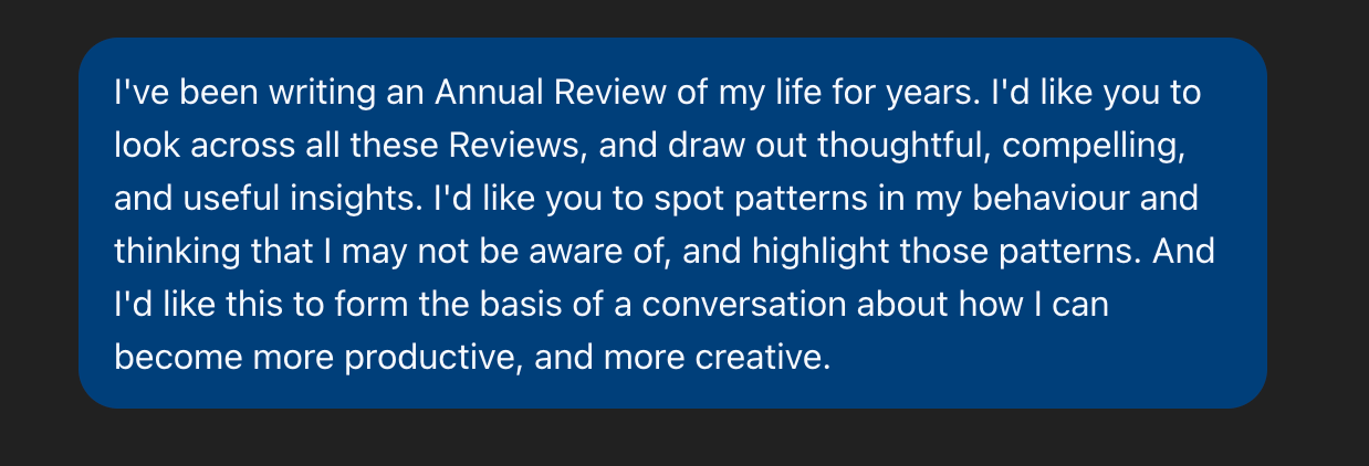 What's more, it seems to me that the rise of LLMs can mean outsized advantages, in all kinds of ways, to people who write. LLMs are hiveminds for the ingestion and output of text. If you have an archive of bespoke text — that is, of your own writing — that you can bring to an LLM, you can coax all kinds of outputs from it that will be in some way exceptional. You can transcend the ocean of average that most AI output will form, and produce something atypical. Those outputs may be useful primarily to you: the outputs ChatGPT will produce on my Annual Review will be an example that falls into this category. Or they may, once combined with further thought and writing of your own, be worth sharing with the world.